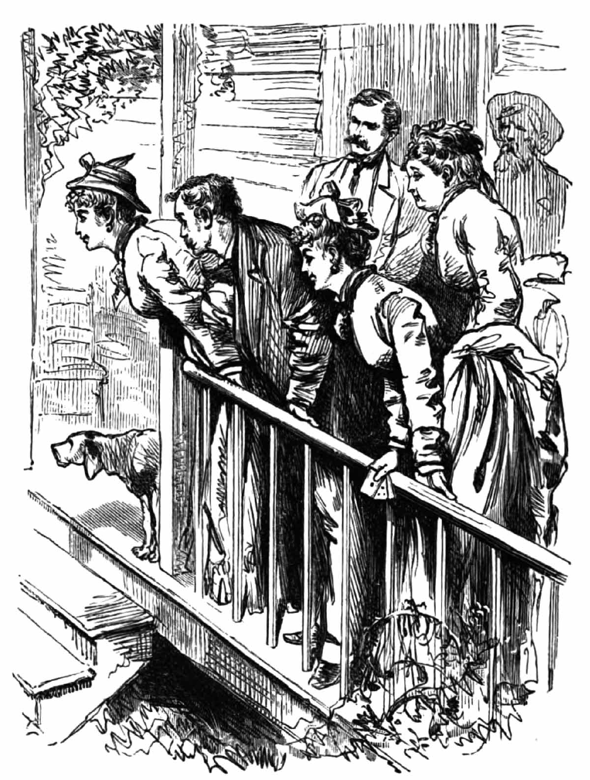 What is before us is a hotel perched on a hill. A few other houses are scattered widely and wildly around. Great wooded mountains rise in the background. The hotel-piazza seems crowded as we approach—Aunt Markham and Eric in front, Charley escorting Sylvia and myself. We are the last of the straggling procession of passengers, and receive the concentrated stares of all the languid ladies with yellow-backed novels in their hands and sundowns on their heads, all the open-eyed children, and lounging men.