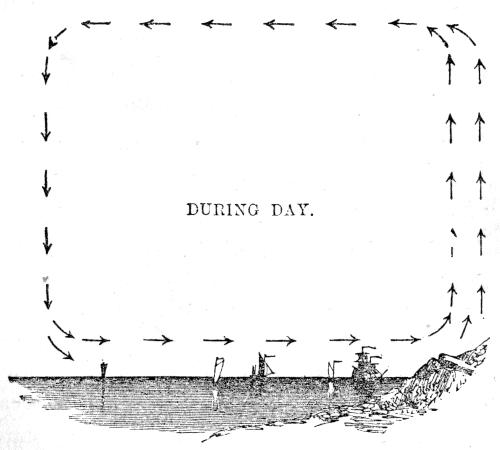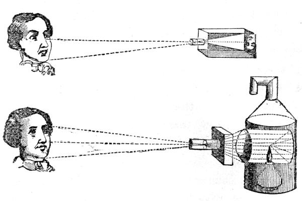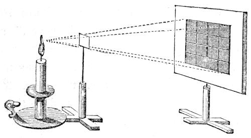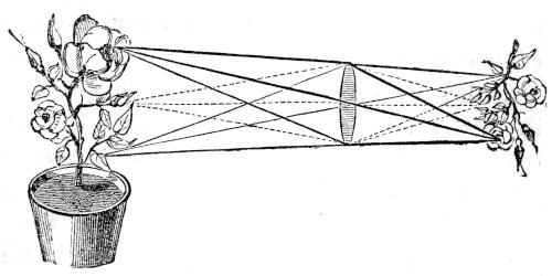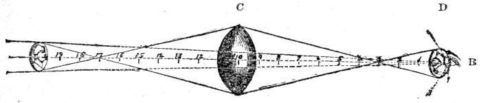 [57] The arrangement of lenses, above described, constitutes the principle of what is termed the “astronomical telescope;” for this makes the objects appear upside down. But, though the inversion of a star or planet is a matter of no moment in astronomical observation, such an effect is most disagreeable when applied to terrestrial objects. The ordinary telescope for land purposes, therefore—or the “day telescope,” as it is usually styled—has two other lenses behind the eye-lens. These lenses have both the same focus as the eye-lens itself, and are placed at a fixed distance from each other, such distance being equal to the sum of their focal lengths: that is to say, if the eye-lens have a focus of 2 inches, then each of the two other glasses should have the same length of focus, and be placed at 4 (2 + 2) inches apart from one another. The magnifying power of the day telescope may be calculated in the same manner as that of the astronomical one above explained; for the two additional lenses in the day instruments, having the same focal length as the eye-lens itself, produce no further enlargement of the objects, but serve only to cross the rays a second time, and so to render the image erect instead of inverted.