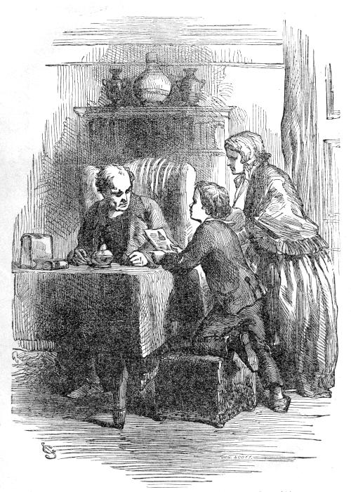 At a table in front of the little assembly sat Mr. John Tonkin, the old gentleman who had addressed them. Nor was he the least remarkable among the company, for he was habited in the costume that had been fashionable in the previous century. Over his shrivelled and veiny hands flapped deep lace-ruffles, and the top of his head was white as a twelfth-cake, with the large powdered wig that surmounted it. The straight, stand-up collar of his Quaker-cut coat was as if mildewed at the back with the powder that fell from his peruke, and the large fan-like frill that protruded from his waistcoat—which was long as a modern groom’s—was speckled brown in places with snuff, as thick as nutmeg on a custard; while from underneath the table at which he sat peeped a pair of gold shoe-buckles and black silk stockings. On a chair by his side lay the cocked hat which [17]completed his antiquated costume, and the underneath part of which was greyed with hair-powder and long usage.