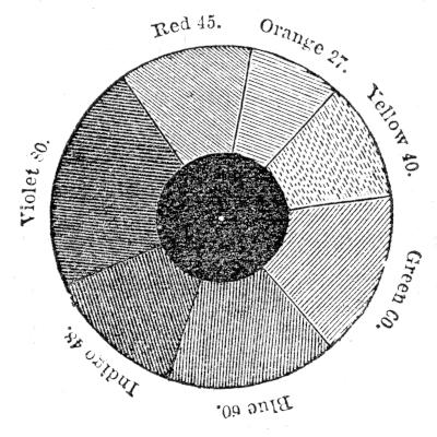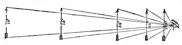 [55] The range of the eye, or diameter of the field of vision, is 110°; consequently, this is the largest angle under which an object can be seen. The largest angle, however, is here made 120°, for the simplification of the numbers. The range of vision is from 110° to 1′.