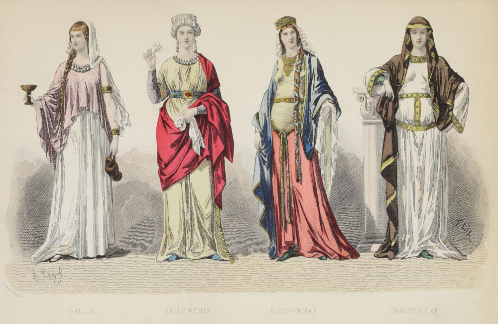 Gallic period—Woad, or the pastel—Tunics and boulgètes—“Mavors” and “Palla”—Cleanliness of the Gallic women—The froth of beer or “kourou”—The women of Marseilles; their marriage-portions—Gallo-Roman period—The Roman garment—The “stola”—Refinement of elegance—Extravagant luxury of women—Artificial aids—A “vestiaire” or wardrobe-room of the period—Shoes—Jewels and ornaments—The amber and crystal ball—Influence of the barbarians 13