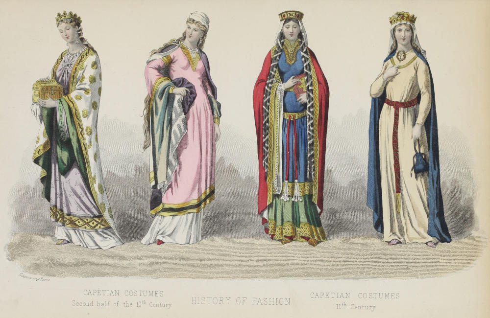 Earliest times of the Carlovingian period—Variety of costume in the provinces—Fashions in the Duchy of France—French taste dating from the eleventh century—Luxury increases with each generation—The dominical—The “bliaud”—Canes of apple-wood—Women in the twelfth century—Head-dresses—“Afiche”—Serpent-tails—Pelisses—The thirteenth century—“Grèves” and veils are in fashion—The “couvre-chef” in the fourteenth century—The skirt, or “cotte-hardie,” surcoat, or overall, or over-skirt, cape, trained skirt, and “gauzape”—Accessories—Emblazoned gowns—Various kinds of stuffs 31
