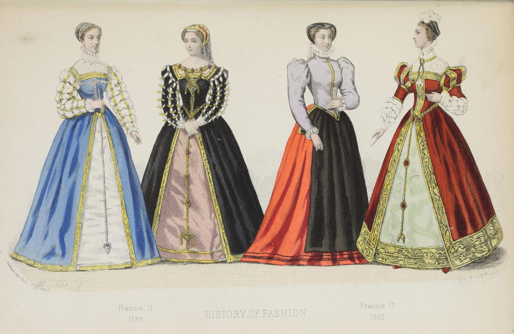 The earliest queens of fashion—Mary Stuart’s costumes; her jewels—Description of bodices and sleeves of that period—Crosses—The “loup” or small mask—Coiffure “en raquette”—An anecdote concerning high heels—Regulations respecting fashion—Remark of a lady of our own day on distinctions in dress—Exordium of the Edict of July 12, 1549—Maximum of marriage portions—The first knitted silk stockings 89