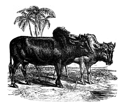 1. The most common of the Indian breeds of the ox tribe is the Zebu, a humped variety, of which the smallest specimens are not bigger than a full-grown mastiff, while others are found almost as large as the finest English cow. They are all useful, both as affording food, and as beasts of burthen.