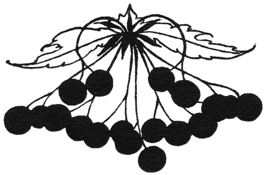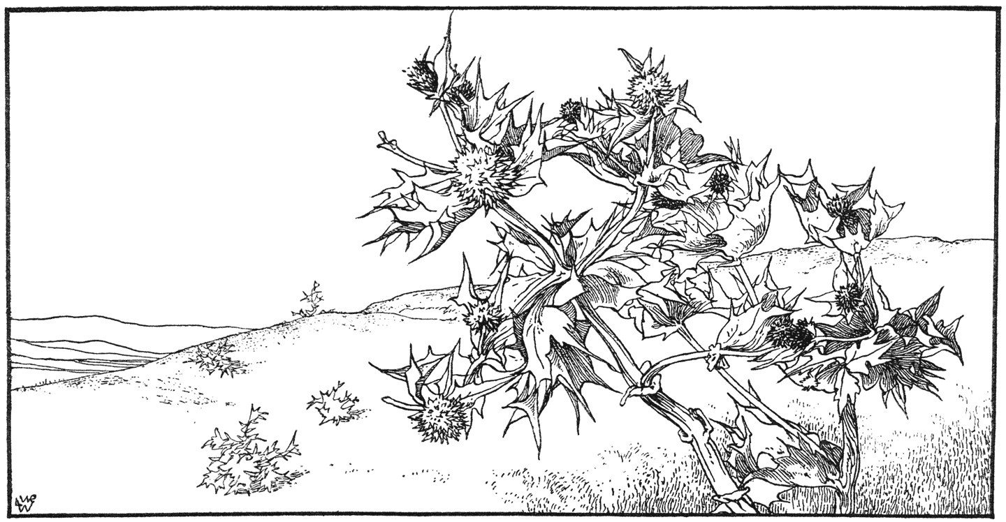 Een groen boschje staat tegen den hoogen duinrichel; als je op den top van ’t duin staat kijk je recht over het heele bosch heen. In ’t midden bestaat het alleen uit berken, maar langs den rand staan al de bloemheesters van Holland: meidoorns, lijsterbessen, egelantiers, berberissen, ligusters (102), wilde sneeuwballen, zoodat tot diep in den zomer bloeiende twijgen wuiven om het frissche berkengroen.