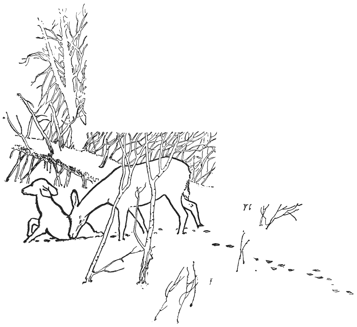 Den vorigen zomer was er even stroomaf van mijn kamp aan ’t Matagammon-meer een stukje strand tusschen twee landtongen door dicht bosch omgeven, waar de herten meer van schenen te houden dan van eenig ander plekje aan ’t heele meer. Toen we er den eersten keer kwamen, waren de herten vlak om ons [10]kamp. Van de deur uit konden we ze soms aan den oever van het meer zien, en elken avond tegen de schemering kwamen ze schuw aansluipen om de aardappel- en appelschillen op te eten. Langzamerhand verdreef het lawaai uit het kamp hen tot de heuvelrijen in de verte, ofschoon ze in stormachtige nachten terugkwamen, als het stil in ’t kamp was en alle lichten waren gedoofd. Van mijn tent uit hoorde ik dan omzichtig geritsel, of ’t kraken van een takje boven ’t kletteren en neergutsen van den regen op mijn tentnok, en als ’k in ’t donker naar buiten sloop, merkte ik dat er een paar herten, gewoonlijk een hinde en haar kalfjes, onder ’t spanen dak van onze houtschuur stonden te schuilen voor den stroomenden regen.