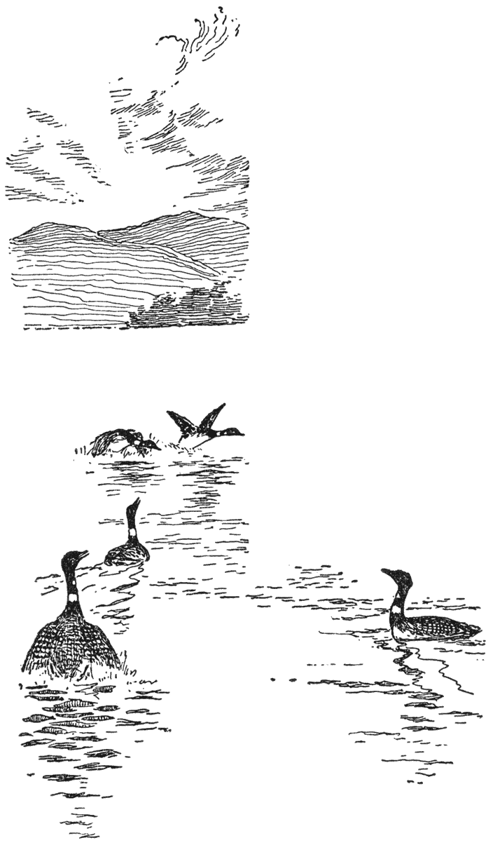 Van alle duikers, die me aanriepen in den nacht of de meren ’s zomers met me deelden, gaf er me slechts één gelegenheid om haar van dichtbij gade te slaan. Het was op een ongerept meer, zoo afgelegen, dat niemand het nog eerder ’s zomers bezocht had, en een duikermoeder voelde zich zoo veilig dat ze den open oever had verlaten, waar ze gewoonlijk nestelt, en haar eieren op een veenklomp had gelegd aan den kop van een nauwe baai. Daar ontdekte ik ze een paar dagen na mijn aankomst.