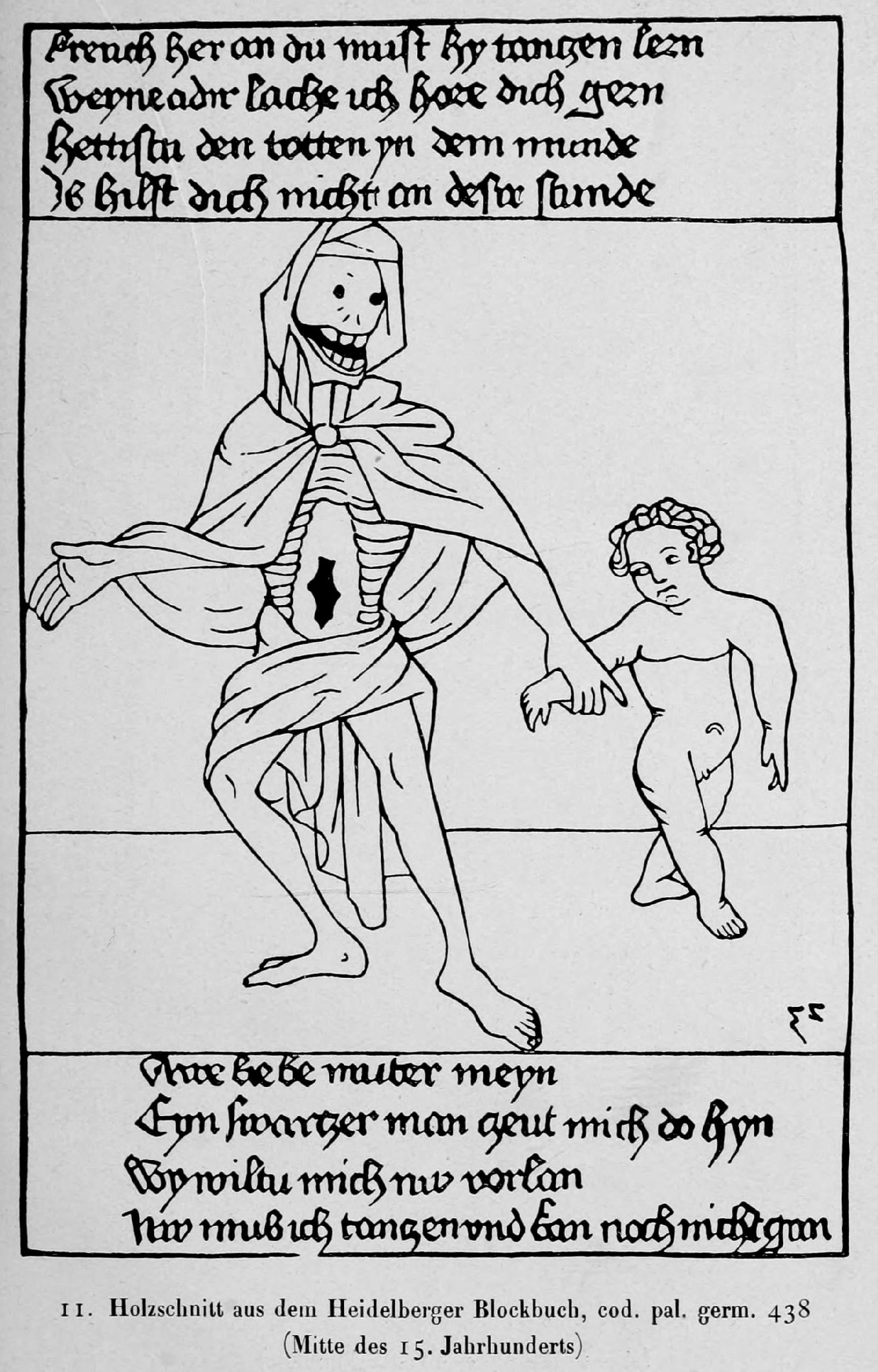 Schon früh fügte man in Frankreich, dann auch in anderen Ländern nach Art der Tituli den Bildern Verse bei, in denen die Lebenden ihr Schicksal beklagten, dann auch die Toten mit Warnungen und Aufforderungen an diese sich wandten. Daneben aber erwuchs ein zweites Gedicht, in welchem nicht der Tote, der Leichnam, sondern der personifizierte Tod die Menschen zum Eintritt in seinen Tanz befiehlt. Dieses Motiv vom Tanze des Todes war genährt durch verwandte Motive aus der Mystik, so daß vielleicht dieser Text aus Deutschland seinen Ursprung nimmt. Auch der neue Dialog vom Tanz des Todes erschien bald unter manchen Bildern, ohne daß der Widerspruch zwischen Darstellung und Wort empfunden wurde.