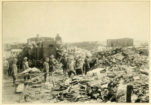 When an animal is first led before a purchasing commission its relation to the Veterinary Corps begins. Every horse and mule must be examined by a veterinary officer for soundness and freedom from physical defects before it can be purchased. As soon as the purchased animals have arrived at the various remount depots they become the objects of unceasing attention by the Veterinary Corps, whose duty it is to keep them free from disease and in the highest state of efficiency. This work includes the sanitary inspection of stables, picket-lines, forage and bedding, methods of feeding, watering, grooming, and shoeing, the detection and segregation of communicable diseases and the establishment of proper quarantine regulations, the care and treatment of all sick animals, the operation of veterinary hospitals, the investigation of the cause and cure of equine diseases, and the keeping of records. Another important duty of the corps in France was the prompt evacuation of all wounded animals in order that they might not hinder the mobility of the troops or engage the attention of the men. In order to facilitate the evacuation of sick and wounded animals from the Zone of the Advance, 21 veterinary hospital [467]organizations—each consisting of 7 officers and 300 men, and each having a capacity of 1,000 sick animals—were trained, organized, and sent overseas. There were also sent to France 2 base veterinary hospitals with a capacity of 500 animals each. Besides this, every cantonment in the United States had its own veterinary hospital, varying in capacity from 200 to 600 animals each. As a result of the scientific methods of sanitation and treatment introduced by the Veterinary Corps, the mortality among animals was enormously reduced (in the early days of the war the British estimated that the average life of a horse in France was only sixteen days), thousands of disabled horses which in former wars would have been shot were evacuated, mended, and sent back to the front for further service, and millions of dollars were saved to the American taxpayer.
