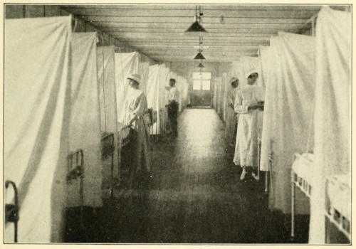 When war was declared, the army possessed in the United States two hospitals for general cases, one for tuberculosis, one for rheumatism, and 113 post hospitals, with a total capacity of 6,665 beds. In order to meet the anticipated needs of our great new armies a vast programme of hospital construction was started in August, 1917, and, though it was greatly curtailed after the sudden collapse of the German war-machine, by March, 1919, the Medical Department had at its disposal in the United States alone a total of 130,564 beds. In other words, the capacity of our army hospitals was increased 1,850 per cent in twenty months—a record which is, I imagine, without parallel in the history of medicine. The total number of medical officers, nurses, and enlisted men on duty in these hospitals during the period of the war was equal to the population of Albany, New York, and the number of cases which were treated—2,000,000 in all—was equivalent to the total population of Chicago. These [458]gigantic hospitals, with their cool, clean wards, their ridge ventilation, their wide corridors, their elaborate heating, lighting, water, and fire-fighting systems, are not surpassed by any civil hospitals of their size in the world. To realize this, one has only to visit them. Indeed, it is not the slightest exaggeration to say that the American soldier received the most expensive kind of medical treatment, in hospitals of the finest type, at the hands of physicians and surgeons many of whom had given up princely incomes and leisurely lives in order to work eighteen hours out of the twenty-four at a captain’s or major’s pay.