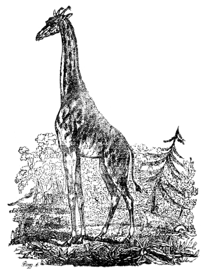 On the staircase of the Museum are also stuffed specimens of a male and female Giraffe, or Camelopard, which were presented to the Museum by Mr. Burchell, the traveller in Africa. The living giraffe which was presented to George IV. in 1827, by the Pacha of Egypt, died in 1829. The other giraffe sent to the 125government of France, in 1827, is still living in the Jardin des Plantes, at Paris. It is impossible from a studied specimen to form an adequate idea of the grace and beauty of this remarkable animal; nor of the impression produced upon the senses by a creature of such enormous height lifting up its head to gather the tender leaves from branches three times as high as a tall man. Till the living giraffes were brought to England and France there was a general belief that the descriptions of this animal were partly fabulous. It is now established that the account which was given of this animal by Le Vaillant, one of the most amusing of travellers, who saw the animal in its native woods, is perfectly accurate. We copy the following description from his Second Voyage, as translated in ‘The Menageries,’ Vol. I.:—