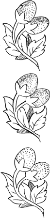 Other materials may be used to advantage; but cloth, velvet, or silk is not suitable for crewel-work. Serge makes a very nice foundation; and a pair of invalid’s slippers, made lately, were worked on white felt. But these were done in Canada, where many materials are to be had which cannot be found here. Said slippers were merely to thrust the toes in, as all the rest was sole; and this white felt pointed piece was ornamented[11] with strawberries in crewel-work. This beautiful fruit is quite as effective as flowers are; and in Figure 12 the clusters may be used separately, or continued indefinitely for a border. A very pretty footstool could be made by grouping them closely for the top, and putting the bordering on the band. The fruit may be either red or white as best suits the groundwork.