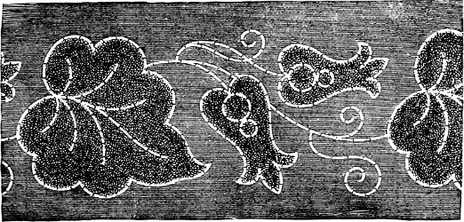 We saw a honeysuckle screen lately, that might have been beautiful, but was not because it had altogether too sombre an air to be viewed in the light of an ornament. The workmanship was fine, and regularly done according to the rules of art, but as the ground was black and the coral honeysuckle was represented in very dull reds and greens, the effect was not enlivening. A gray ground of a silver tinge would have been a great improvement, but dark work on a dark ground is a dismal production.