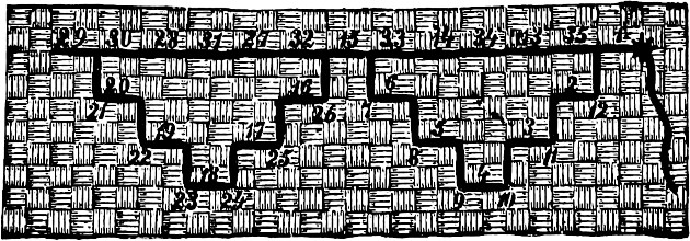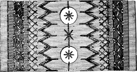 The oldest specimen of this kind of work now in existence is the famous tapestry of Bayeux—the work of the English Matilda and her attendants. A piece of embroidery over two hundred and twenty feet long, although not much more than half a yard wide, is no trifling accomplishment; and in spite of the red, blue, green, and yellow horses, some of them with two legs of a different color from the rest of their bodies, one cannot but reverence this curious triumph of the needle that can claim eight centuries of birthdays. It is entirely worked with worsted in very little variety of coloring, as the Norman princess had few advantages of this sort, but she has represented to the best of[6] her ability the invasion and conquest of England by Duke William and his followers. The battle of Hastings is ingeniously emphasized by a bordering composed of the bodies of the slain.