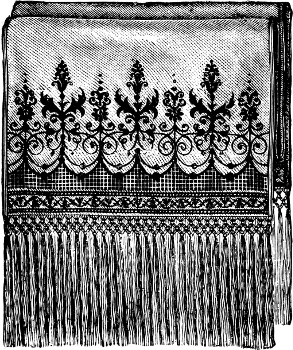 was the favorite needlework of those days; and these hangings, or “veils,” were rendered necessary by the style of building, which afforded many convenient chinks and loopholes for the wind. Some of these ancient pieces of embroidery were very rich, the designs being worked with worsted or silk of various colors, and often mixed with gold or silver threads, on canvas, cloth, or silk.