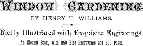 A ready and invaluable aid to all who wish to adorn their houses in the easiest and most successful manner with plants, or vines, or flowers. Instructions are given as to the best selection of plants for Baskets or Ferneries and Wardian Cases. Several chapters are devoted to Hanging Baskets, Climbing Vines, Smilax, and the Ivy, for decorative purposes. Bulbs for House Culture are fully described; also ornamental Plants for Dinner Table Decoration. Other topics are well considered, such as Balcony Gardens, House Top Gardening, Watering Plants, Home Conservatories, Fountains, Vases, Flower Stands, Soil, Air, Temperature, Propagation, Floral Boxes, the Aquarium, Rustic Conveniences for Household Ornament, and directions in detail for the general management of in-door plants for the entire year, throughout the winter, spring, summer, and fall. The volume is profusely illustrated with choice engravings, and pains have been taken to make it one of the most attractive books ever issued from the American Press. For sale, or supplied by bookstores everywhere, or sent post-paid by mail on receipt of price.