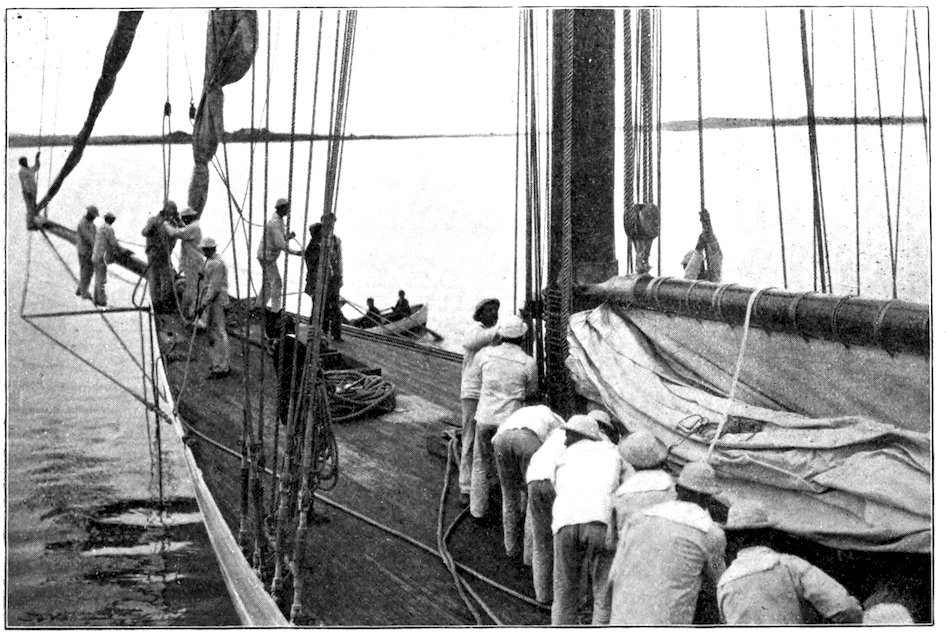 It is well for all hands to get aboard in good time, so as to have ample opportunity to prepare for the business of the day. I will take it for granted that you are properly clad for the work ahead, that you have left your frock coat and gafftopsail hat ashore, where they belong, and that your apparel is suited for the occasion. I am no Beau Brummel, to act as arbiter elegantiarum in the matter of attire afloat or ashore, but I have seen some queerly rigged specimens of amateur sailors in my time, and have observed what an amazing fund of fun they furnish to the curious onlooker surveying the scene from the outside. Gorgeous “blazers,” silken sashes of variegated hues, acting as soul and body lashings round the midship section and supporting trousers of spotless white jean, with the accessories of an expensive straw hat, a “biled” shirt, silken hose and pipeclayed deck shoes—all these may look ornamental and captivating, but the common-sense element of utility is lacking. Such bright plumage may be suitable for the deck of a steam yacht with pretty girls aboard, or for the casino of a swell seaside resort, but a simple suit of flannel and a white duck yachting cap is the sort of garb best adapted for the work to be tackled.