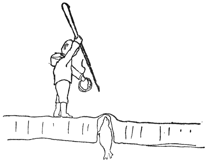 Ons het ’n hele ruk, tot by die knieë in die modder, gestoot en getrek totdat ons hom eindelik weer in die water gekry het. Art het [18]skoene aangehad, dus probeer ek, om hom na die skuit te dra, maar hy was te swaar. Toe bring ons die skuit nader aan die wal en Pa probeer om Art te dra. Pa het vir Art op sy rug—Art is ’n groot man en weeg seker 190 pond—en begin net om uit te kom, toe die ekstra gewig sy voete tot bokant sy stewels in die modder druk, en toe ons probeer om sy bene uit die modder te trek, verloor hy sy een stewel; hulle verloor albei hulle ewewig en val in die modder en water. Hulle het dit albei as ’n grap opgevat en moes toe amper ’n myl omloop eer ons ’n plek kon kry waar ons hulle maklik kon oplaai.