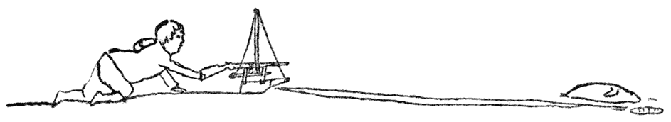 Soos julle seker weet, beteken „ruwe berekening” [145]dat mens uitvind waar jy is deur te sien hoeveel myle die skip volgens die log afgelê het. Die log is ’n klein instrument soos ’n klein skeepskroef wat by die agterstewe aan ’n lang tou afgelaat word; dit draai vinnig of stadig volgens die snelheid waarmee die skip vaar, en die getal omwentelinge word aangeteken, waardeur die getal knope of seemyle wat die skip afgelê het, aangewys word.