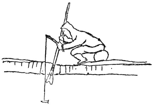 Ons het na ’n paar winterhuise van die Eskimo’s (of ighloes van klip) omtrent ’n myl van die stasie gegaan. Hulle is baie oud, en is eeue gelede deur ’n stam bewoon; maar dit was so lank gelede dat die teenswoordige Eskimo’s niks van hulle afweet nie en glo dat hulle van heeltemal ’n ander ras was. Dr. Rasmussen beweer dat volgens die voorwerpe wat in hierdie ou dorpie gevind is, vergeleke met ander wat alreeds bestudeer is, die mense waarskynlik [151]omtrent duisend jaar gelede daar gewoon het, en op ander plekke miskien nog vroeër, omtrent die tyd toe die eerste Noormanne na Groenland gekom het in die jaar een duisend en later.
