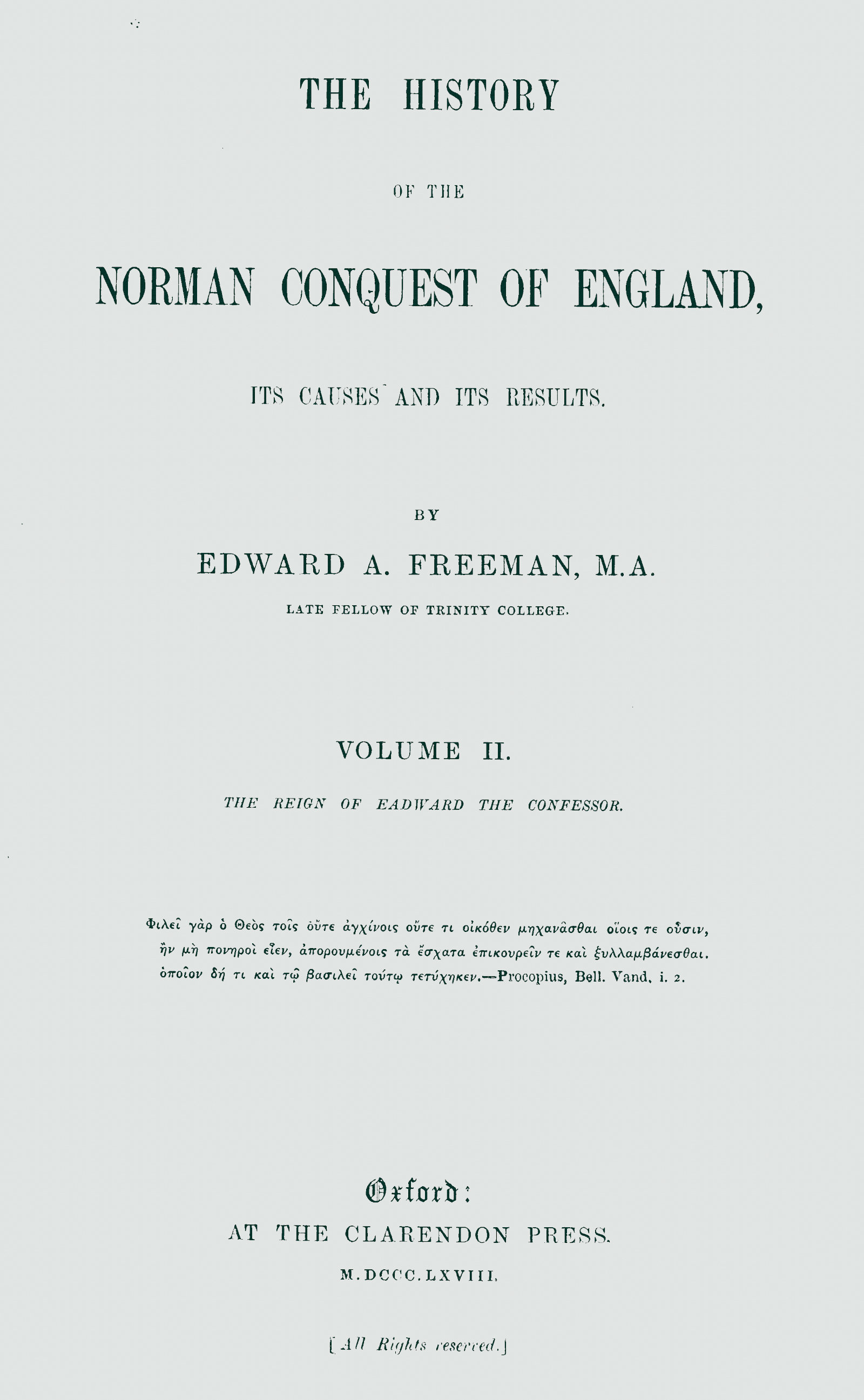 My first volume was preliminary. I am now able to announce the exact extent and scheme of my book. My plan now extends to five volumes. The present volume takes in the first stage of the actual struggle between Normans and Englishmen, that is, the Reign of Eadward the Confessor. I begin with Eadward’s election, and I continue the narrative to his death. I take in also the early years of William in Normandy. In this period the struggle is not as yet a struggle of open warfare: it is a political struggle within the Kingdom of England. Harold and William gradually come to be the leaders and representatives of their several nations; but they are not, during the time embraced in the present volume, brought into any actually hostile relation to one another.