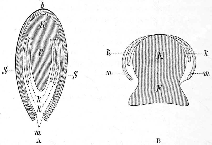 Fig. 143.—Diagrams to explain the form of the body of a Mollusc. A, a Bivalve Mollusc; B, a Snail (cross sections). In both; K, body; F, foot; S, shell; m, mantle; k, k, gills.