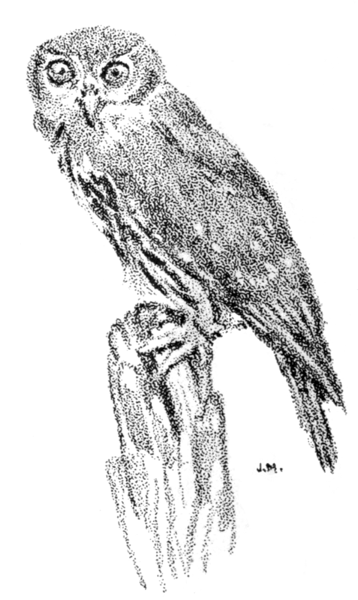 Then there are owls—three or four sorts of them—which drift in absolute silence from place to place. On moonlit nights a sudden shadow floats on the ground before you, and if you look up quickly enough you will see a white form settling silently on a branch or post. If you keep very still and watch patiently you may see him dart down to catch some flying insect, or make a sudden swoop at a mouse in the grass below. How they see their prey is always one of the wonders of nature to me, but apparently they never miss. I like the names of my owls—the delicate owl, the masked owl and the Boobook owl—the last so named from his familiar double note “Boo-book.”