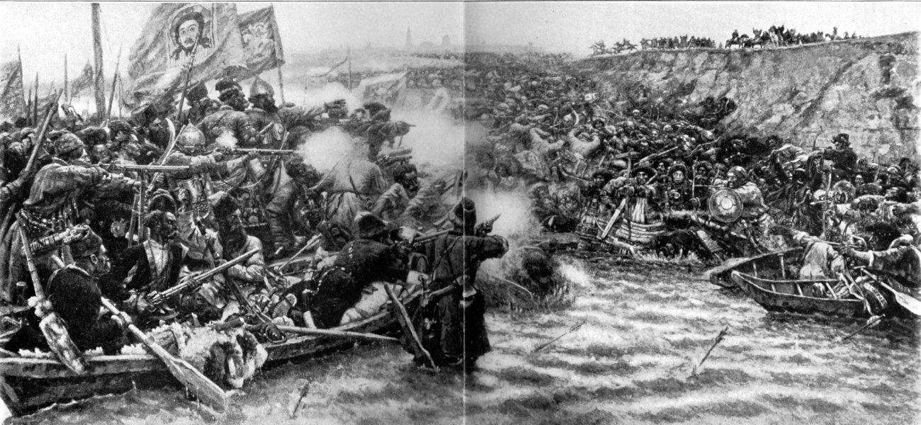 | Yermak’s Expedition to Sibir, attacked by the Tatars From a painting by Surikova |