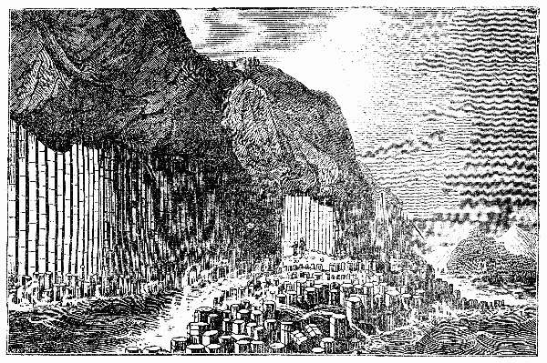 The highest part of the line of pillars is at the southern end of the island; and it is here that the celebrated natural excavation called Fingal’s Cave is situated. Its opening is very near the south-east corner, and it extends nearly due north. The name by which it is commonly known, we may remark in passing, would rather appear to be merely a modern and accidental designation. Sir Joseph Banks states, that upon asking his Highland guide what it was called, the boy answered in Gaelic, the Cave of Finlin; and in reply to a second question, explained Finlin to be Finlin-Mac-Coul; or, as he had been called by the English translator of Ossian’s poems, Fingal. This fragment of criticism, however, we may fairly suppose to have been really the remark, not of the guide, but of the interpreter. A subsequent visitor of Staffa, the French geologist, M. Faujas Saint Fond, says, that on making minute and careful inquiry into the matter, on the spot and in the neighbourhood, he could not learn that any person there knew the cave by the name which Banks had given it. It was universally 238called Uamh an Binn, that is, the Cave of Music. And the explanation which he received of Banks’s error, or rather that of his interpreter, was, that binn being pronounced vinn, and Finlin being in the genitive Fin, of which the sound is nearly the same, the one word had been mistaken for the other. This is a curious and not an uninstructive example of the degree of certainty that belongs to information thus obtained. However, it is not impossible, whatever be the common name of the cave, that there may be also a tradition of its having been the work of the great Fingal, to whom other such stupendous miracles of nature in various other parts of the Highlands of Scotland are popularly ascribed, and who has also, we believe, the credit of being the architect of the Giant’s Causeway in the sister island. This conjecture is rather confirmed by an anecdote which is related by another traveller among the Hebrides, Dr. Thomas Garnett, who has also given us an account of Staffa. “Our interpreter,” says he, “on hearing me express my admiration of this wonder of nature, told me that it was generally considered as the work of Fion-macool, but that for his part he thought it had been built by St. Columba!”