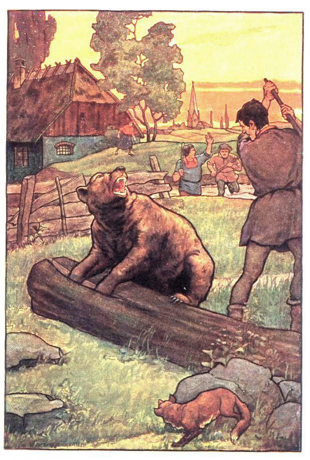 Als Rüsteviel den Bären erblickte, lief er sogleich ins Dorf, rief alle Bauern zusammen und sprach: »In meinem Hof hat sich[S. 18] ein Bär gefangen, kommt geschwind mit mir!« Schleunigst folgten ihm alle; ein jeder nahm eine Waffe: der eine eine Heugabel, der andere eine Harke, der dritte einen alten Spieß, der vierte einen Zaunpfahl. Der Pfarrer und der Küster kamen auch herbei. Ja, sogar des Pfarrers alte Köchin wollte dabei nicht fehlen; sie hatte als Waffe ihren Spinnrocken ergriffen, um damit des Bären Fell gehörig zu bearbeiten. Als der arme Braune den Lärm und das Geschrei der vielen Menschen hörte, ward ihm himmelangst zumute. Mit gewaltigem Ruck riß er den Kopf aus der Spalte, doch, o weh! die ganze Haut mit beiden Ohren blieb darin stecken, und das Blut rieselte ihm am Halse herunter. Und noch immer war er an den Pfoten gefesselt. Näher und näher kam das Toben. Da riß er mit größter Kraftanstrengung die Tatzen heraus, doch das Fell blieb im Spalt stecken. Die Füße taten so weh, daß er nicht laufen konnte; da kamen auch schon die Bauern herbei und fielen über ihn her mit Schlägen und Stößen. Auch die Weiber halfen mit, ihm das Fell zu gerben. Der Pfarrer schlug ihn mit einem langen Stabe. Von fern warfen sie mit Steinen. Endlich kam auch noch Rüsteviels Bruder und versetzte ihm einen so wuchtigen Schlag vor den Kopf, daß ihm für einen Augenblick Hören und Sehen verging. Dann aber sprang er rasend vor Schmerz empor und geriet zwischen die Weiber. Diese erschraken gewaltig und sprangen so eilig davon, daß viele in den tiefen Mühlbach stürzten. Da rief der Pfarrer: »Kinder, seht, dort schwimmt Frau Jutte, meine treffliche Köchin! Zwei Tonnen Bier gebe ich zum Besten, wenn ihr sie rettet!« Da liefen alle zum Bache und retteten die Weiber.