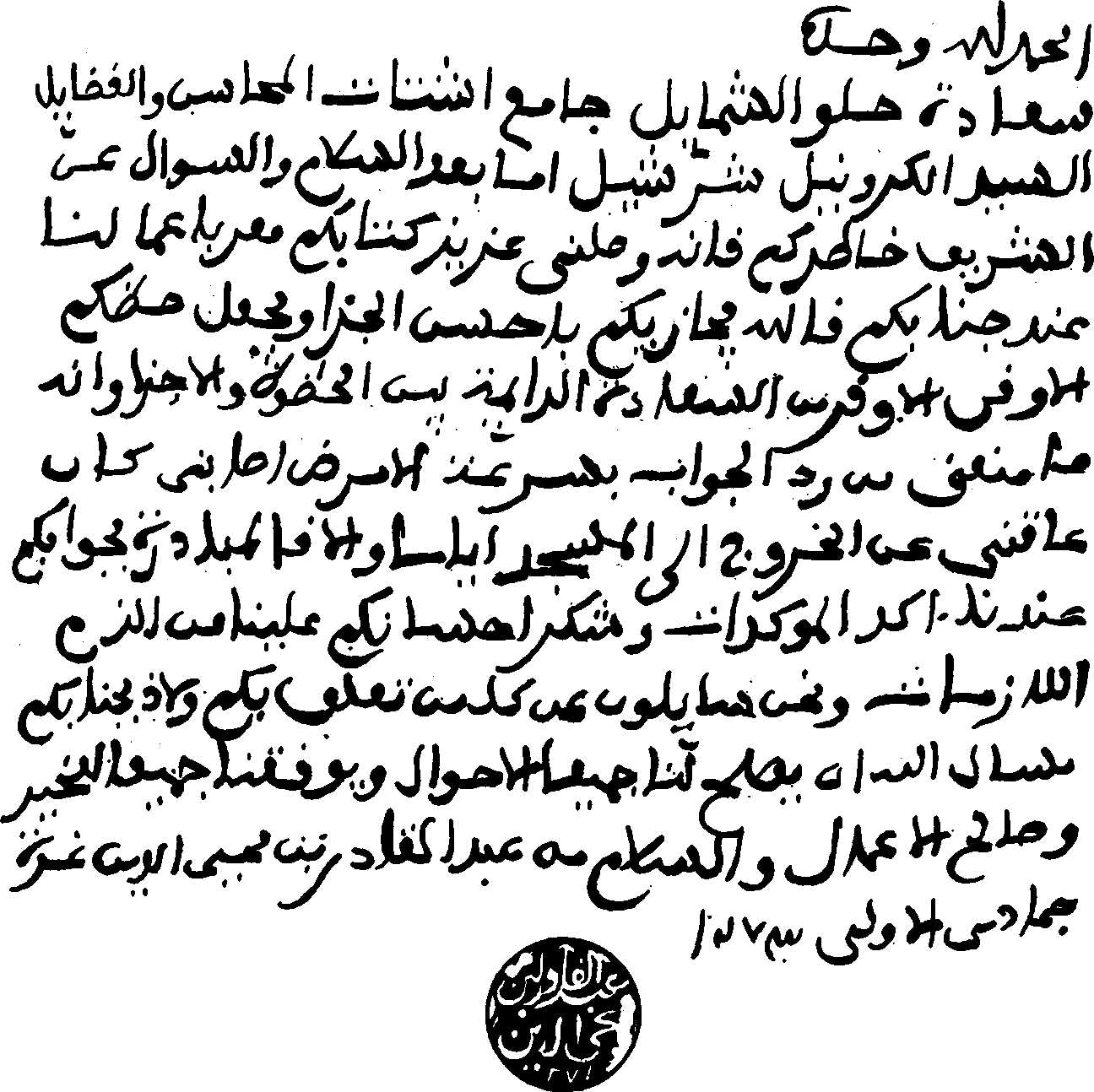 “This comes from him who has great need of his all-abundant mercies, Abdel Kader, son of Mehi-ed-deen, il Hassany, and is addressed to his brother and friend in God, the glorious Schamyl. May God be favourable to us and you, at home and abroad! May the peace and grace of God rest ever upon you!