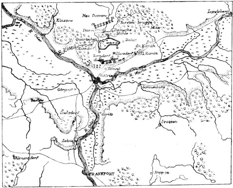 It must be noted that Gustavus continued active operations throughout the winter, in contrast to the habits of the age. In January 1631 his troops, clothed in sheep-skins, quitted Stettin, and New Brandenburg, Loitz, Malchin, and Demmin fell to their arms. These successes brought Tilly raging with fury on their track. Traversing Brandenburg amid blood and flame, he captured New Brandenburg by assault. Gustavus had skilfully concentrated his forces to protect the town at Friedland and at Pasewalk, but was informed by his lieutenants that the troops were so demoralized by the idea of encountering Tilly’s terrible bands that they were not to be relied on! In this desperate emergency the genius of the Swede stood by him. While Horn disputed the passage of the Peene and Trebel by the Imperialists, the King[6] ascended the Oder with the bulk of his forces, and, taking post at Schwedt, menaced the enemy’s right and rear so that Tilly rapidly retraced his steps, and, finding the Swedish position impregnable, continued his retreat to Magdeburg. When the field was clear, Gustavus, dashing out of his camp, appeared before Frankfort-on-the-Oder. On the 3rd April the assault was sounded, the gates were blown open by his petards, and the fortress succumbed amid great slaughter. Shortly afterwards Landsberg encountered a similar fate.