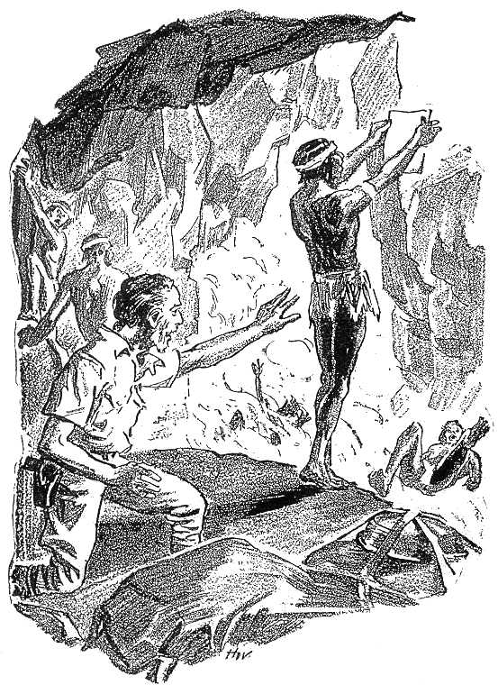 But Itza had no such fears. Swiftly she embraced King Azcopil, she threw her arms about Nohul Voh and planted a farewell kiss upon his cheek, and with a merry laugh and a wave of her hand stepped confidently from the verge of the rock. My heart skipped a beat, I uttered an involuntary cry as she did so. It seemed impossible that she would not be dashed to death in the abyss. But no. She might have been treading solid metal. Lightly she ran forward, calling me to follow. With a last clasp of my hand I stammered farewells to my two friends, and with gritted teeth and summoning all my courage, I stepped onto the incredible bridge and hurried after Itza.