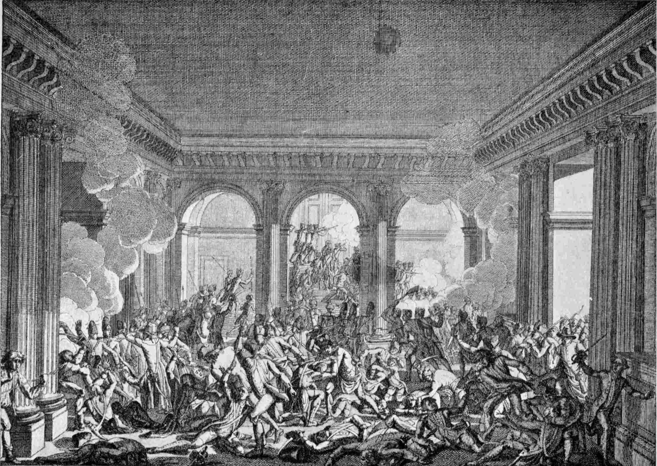 It was not until nearly a full hour had passed, until a commotion farther up toward the palace, and the shouted presenting of arms announced the arrival of the king that these six hundred, now at the limit of their restrained and profound exasperation, were at last admitted to the ramshackle wooden corridor that was their only vestibule. They folded their umbrellas, shook the rain from their cloaks, and, hat under arm, filed through the inner way which led to the back of the hall.{33} Thus did they meanly enter it, at last, humiliated and angry, they who would be the nation itself.