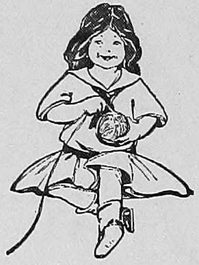 Pompons: Cut 2 round pieces 1¼ inches in diameter from thin cardboard and make a hole in center ⅜ of an inch. Use the yarn double and sew over and over until the hole is filled. Cut the threads between the cardboards, take a strong linen thread and wind around between boards a few times and tie. Remove the cardboards, trim ball even and fasten to cord.