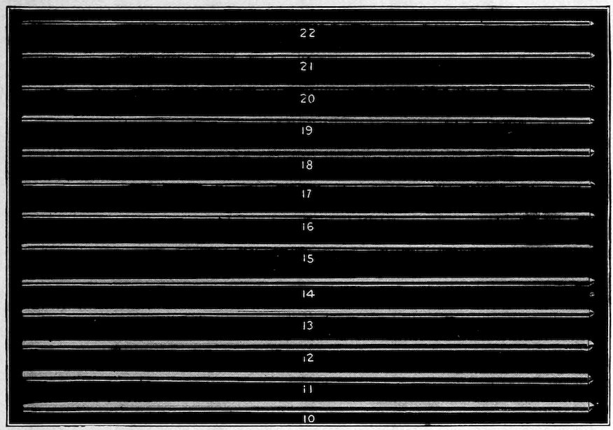 Notice: 2 needles (forward and back) complete 1 row in the Patent Stitch. 7 rows (14 needles) measure 1 inch.