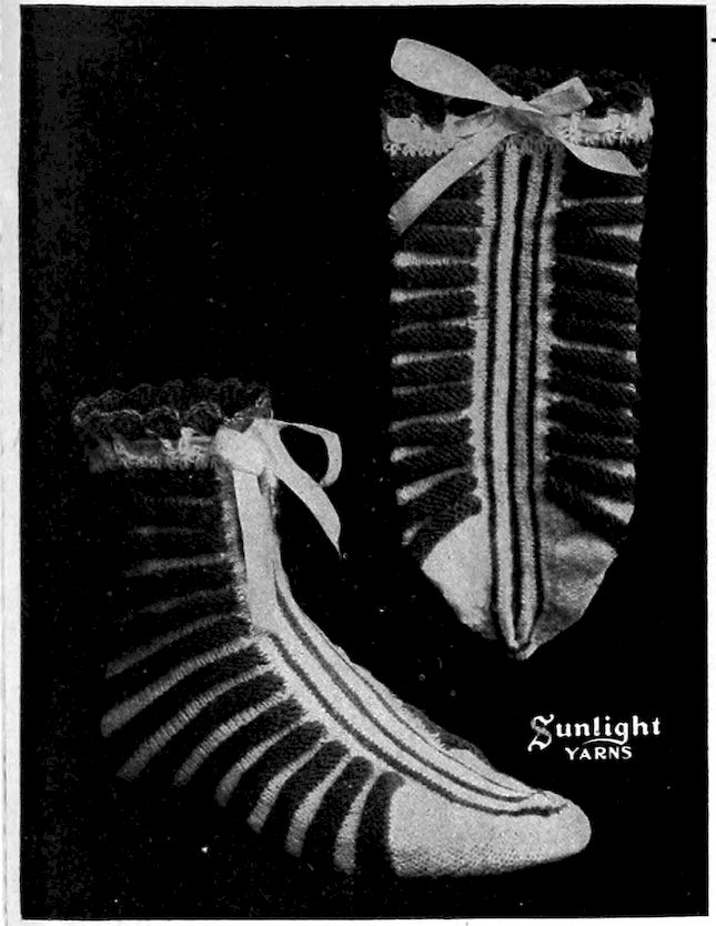 These serviceable bed socks are crocheted with the ribs alternating in pink and white. A pretty border is worked at top and a cord with little pompons on is pulled through to tie with.