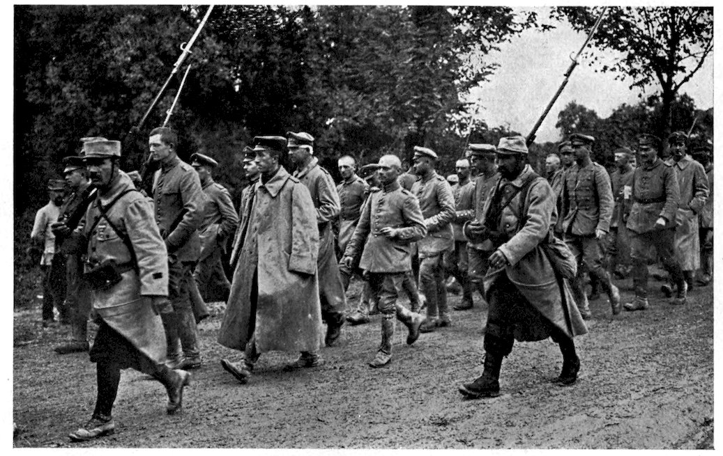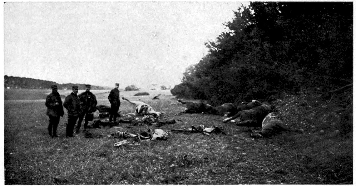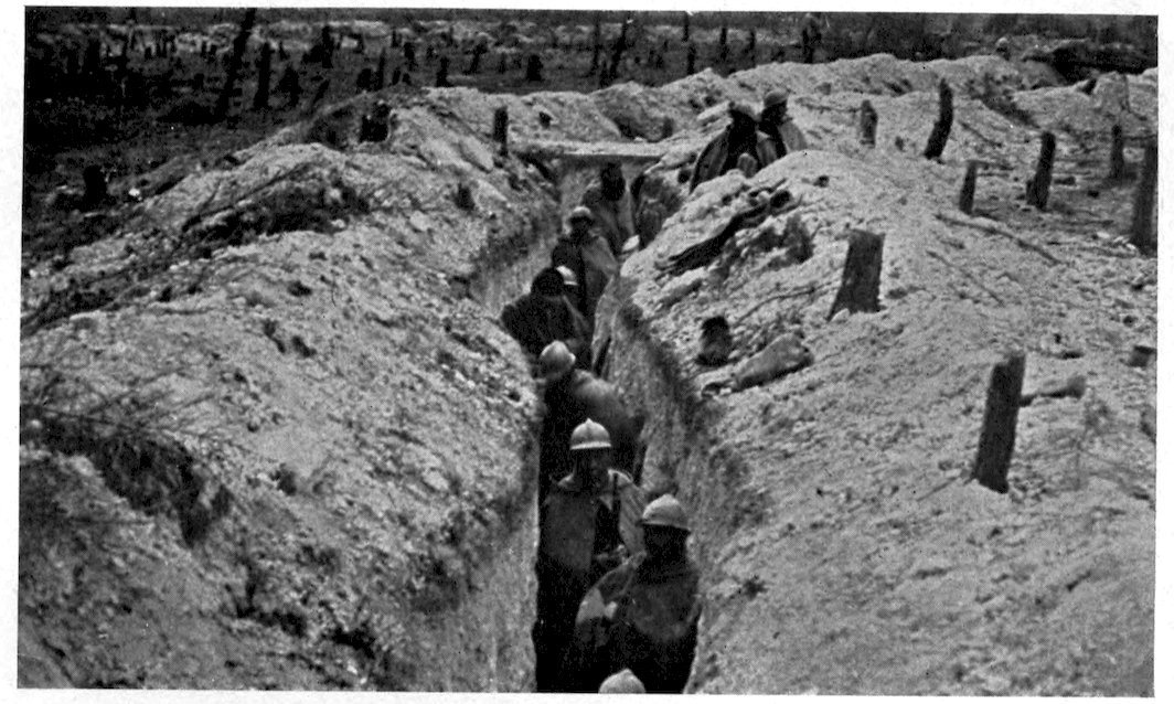 167Great as was the destruction wrought by 168the bombardment, the French infantry had 169no easy task before them, for stretches of wire entanglements still remained in front of portions of the German trenches, while at frequent intervals the Germans had left behind them machine-gun sections, who from their sunken positions poured in a deadly fire, until the oncoming wave overwhelmed and blotted them out. It was these death-traps that brought out in the French soldier those same heroic qualities which had enabled him, under 170the leadership of Napoleon, to enter as a conqueror every capital in Europe. A man who was shot while cutting a way for his company through the wire entanglements, turned and gave the cutters to a comrade before he fell. A wounded soldier lying on the ground called out to an officer who was stepping aside to avoid him: “Go on. Don’t mind stepping on me. I’m wounded. It’s only you who are whole who matter now.” A man with his abdomen ripped open by a shell appealed to an officer to be moved to a dressing-station. “The first thing to move are the guns to advanced positions, my friend,” was the answer. “That’s right,” said the man; “I can wait.” Said a wounded soldier afterward in describing the onslaught: “When the bugles sounded the charge and the trumpets played the Marseillaise, we were no longer mere men marching to the assault. We were a living torrent which drives all before it. The colors were flying at our side. It was splendid. Ay, my friend, when one has seen that one is proud to be alive.”
