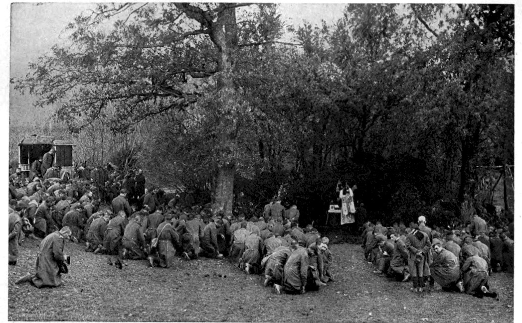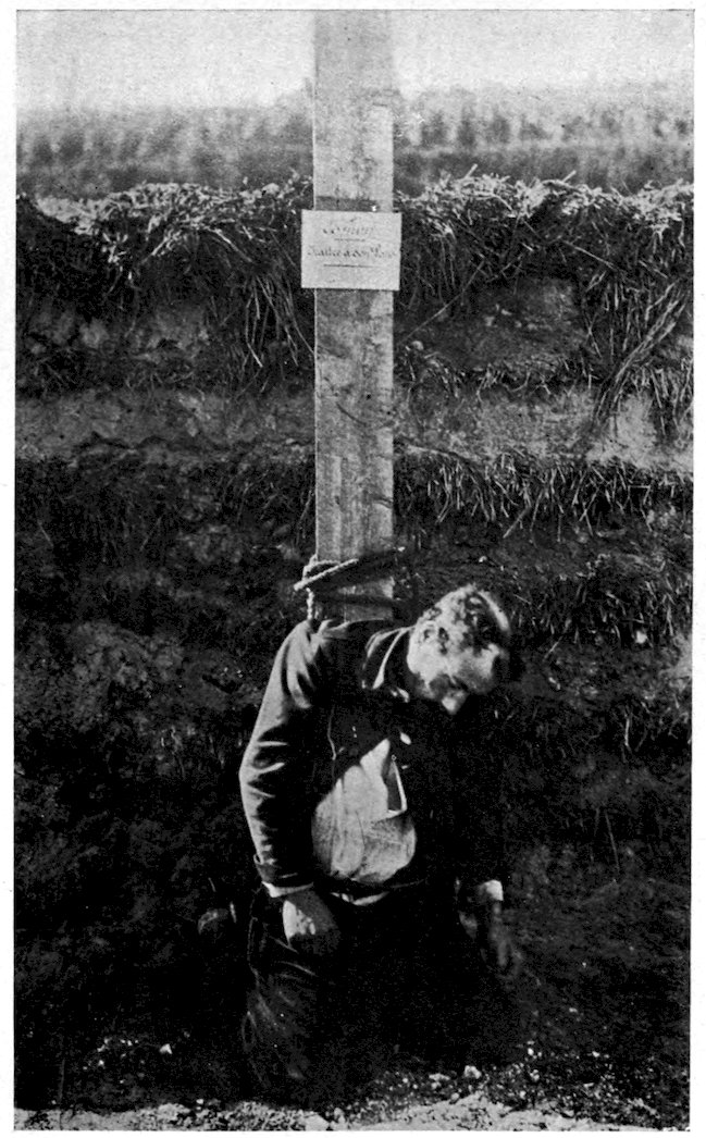 175Though when I visited the battle-field of 176Champagne the guns were still roaring—for the Germans were attempting to retake their lost trenches in a desperate series of counter-attacks—the field was already dotted with thousands upon thousands of little wooden crosses planted upon new-made mounds. Above many of the graves there had been no time to erect crosses or headboards, so into the soft soil was thrust, neck downward, a bottle, and in the bottle was a slip of paper giving the name and the regiment of the soldier who lay beneath. In one place the graves had been dug so as to form a vast rectangle, and a priest, his cassock tucked up so that it showed his military boots and trousers, was at work with saw and hammer building in the centre of that field of graves a little shrine.