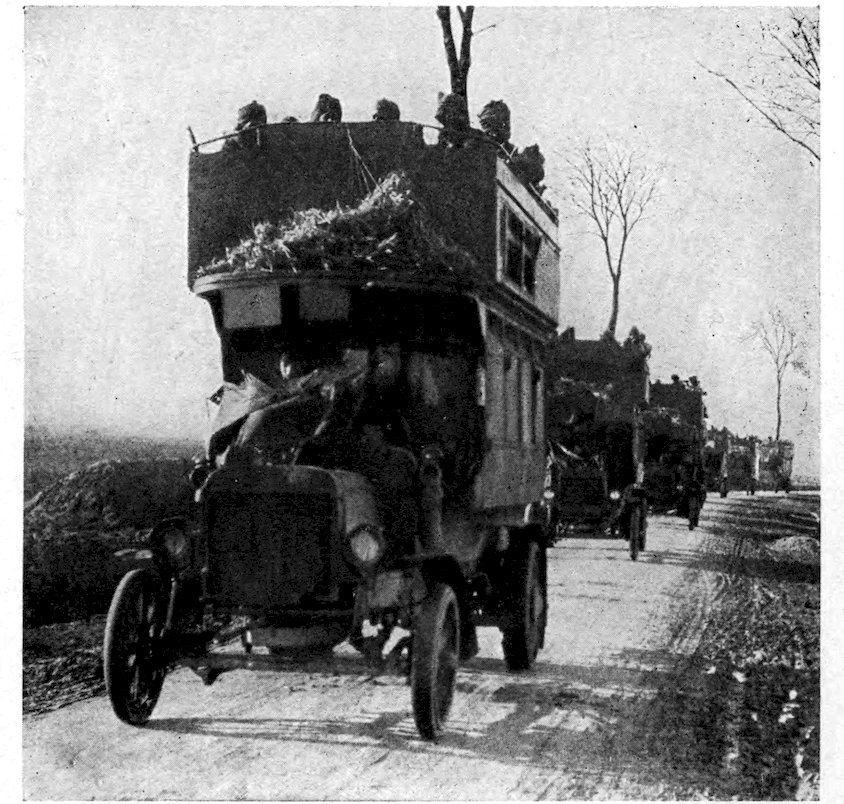 Darkness was falling rapidly when I turned my back on the great battle-field, and the guns were roaring with redoubled fury in what is known on the British front as “the Evening Hate” and on the French lines as “the Evening Prayer.” As I emerged from the communication trench into the highroad where my car was waiting I met a long column of infantry, ghostly figures in the twilight, with huge packs on their backs and rifles slanting on their shoulders, marching briskly in the direction of the thundering guns. It was the night-shift going on duty at the mills—the mills where they turn human beings into carrion.