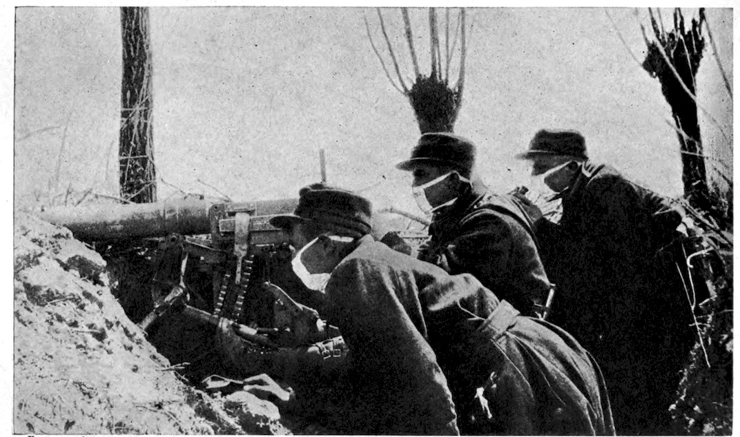 | Machine-gun squad wearing masks as a protection against the asphyxiating gas with which the Germans precede their attacks | 84 | |