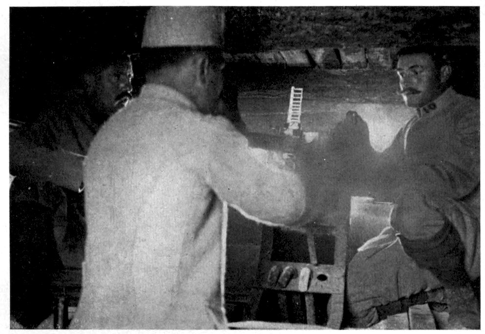 | French artillery officers, in an observatory on the Aisne, watching the effect of shell-fire on the German trenches | 19 | |