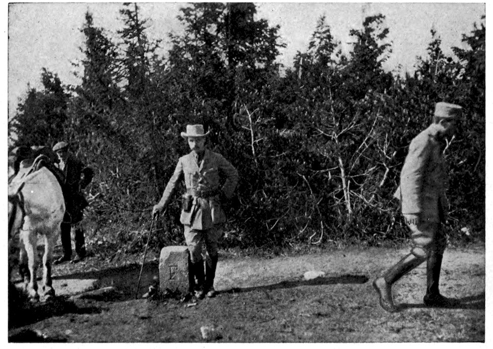 When the Ministry of War had reluctantly issued me the little yellow card, with my photograph pasted on it, which, so far as this war is concerned, is the equivalent of Aladdin’s lamp and the magic carpet put together, and I had become for the time being the guest of the nation, my path was everywhere made smooth before me. I was ciceroned by a staff-officer 4in a beautiful sky-blue uniform, and other officers were waiting to explain things to me in the various divisions through which we passed. We travelled by motor-car, with a pilot-car ahead and a baggage-car behind, and we went so fast that it took two people to tell about it, one to shout, “Here they come!” and another, “There they go!”