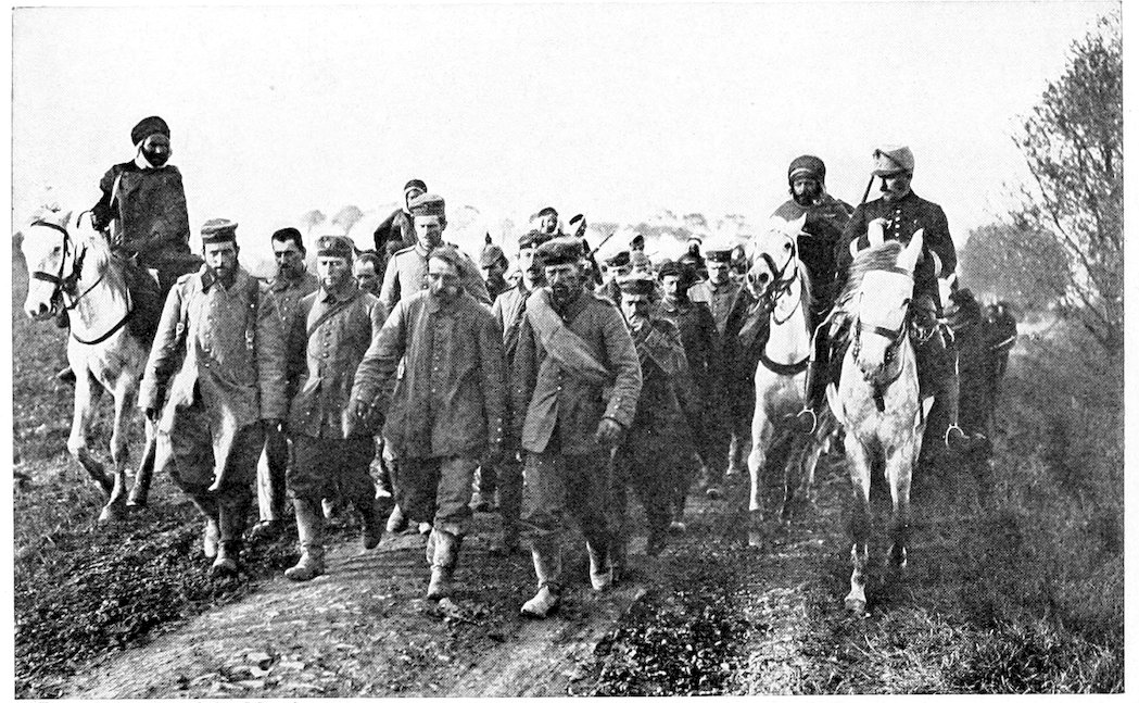 Choosing the psychological moment, when the retirement of the Germans showed signs of turning into panic, the African troops were ordered to go in and finish up the business with cold steel. Before these dark-skinned, fierce-faced men from the desert, who came on brandishing their weapons and shouting “Allah! Allah! Allah!” the Germans, already demoralized, incontinently broke and ran. Hard on the heels of the Africans trotted the dragoons and the chasseurs à cheval—the first time since the trench warfare began that cavalry have had a chance to fight from the saddle—sabring the fleeing Germans or driving them out of their dug-outs with their long lances. But in the vast maze of communication trenches and in the underground shelters Germans still swarmed thickly, so the “trench cleaners,” as the Algerian and Senegalese tirailleurs are called, were ordered to clear them out, a task which they performed with neatness and despatch, revolver in one hand and cutlass in the other. Even five days after the trenches were taken occasional Germans were found in hiding in the labyrinth of underground shelters.