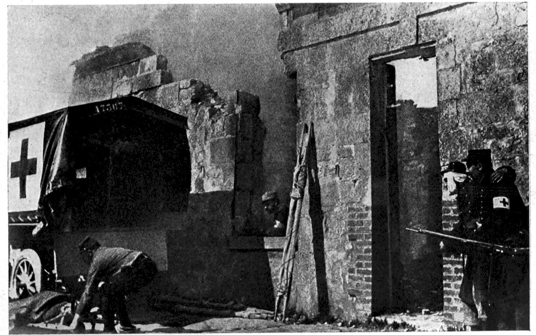 Red Cross men getting wounded out of a bombarded town in Flanders.