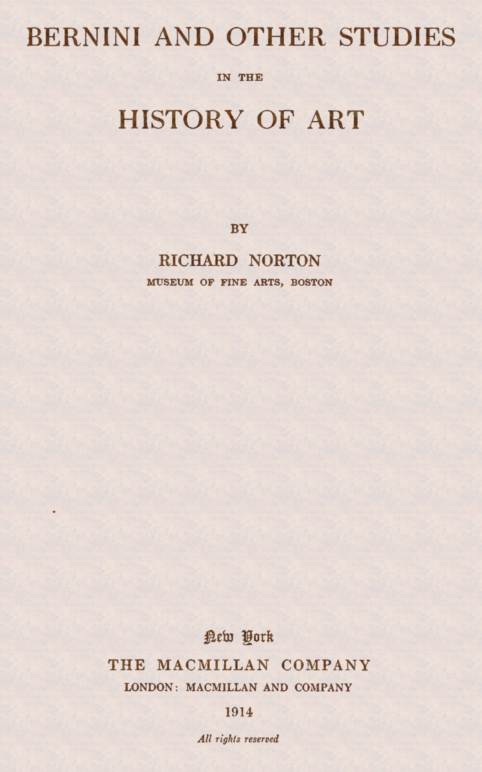 The choice of illustrations has been difficult. It has seemed best, however, to reproduce in full the little-known sketches of Bernini showing the development, in his mind, of the design for the Piazza of St. Peter’s, and the sculptor’s models wrought by his own hands. For the rest I have thought that it would be more serviceable for the reader to have a few typical examples illustrating the main points of the text rather than a larger, and perhaps more confusing, selection of subjects from the almost inexhaustible wealth of available material. I am under deep obligation for the generous permission to include among the illustrations material in the Brandegee Collection (at Faulkner Farm, Brookline, Massachusetts) hitherto unpublished. The heliotype plates were prepared and printed under the direction of Mr. William C. Ramsay, of Boston.