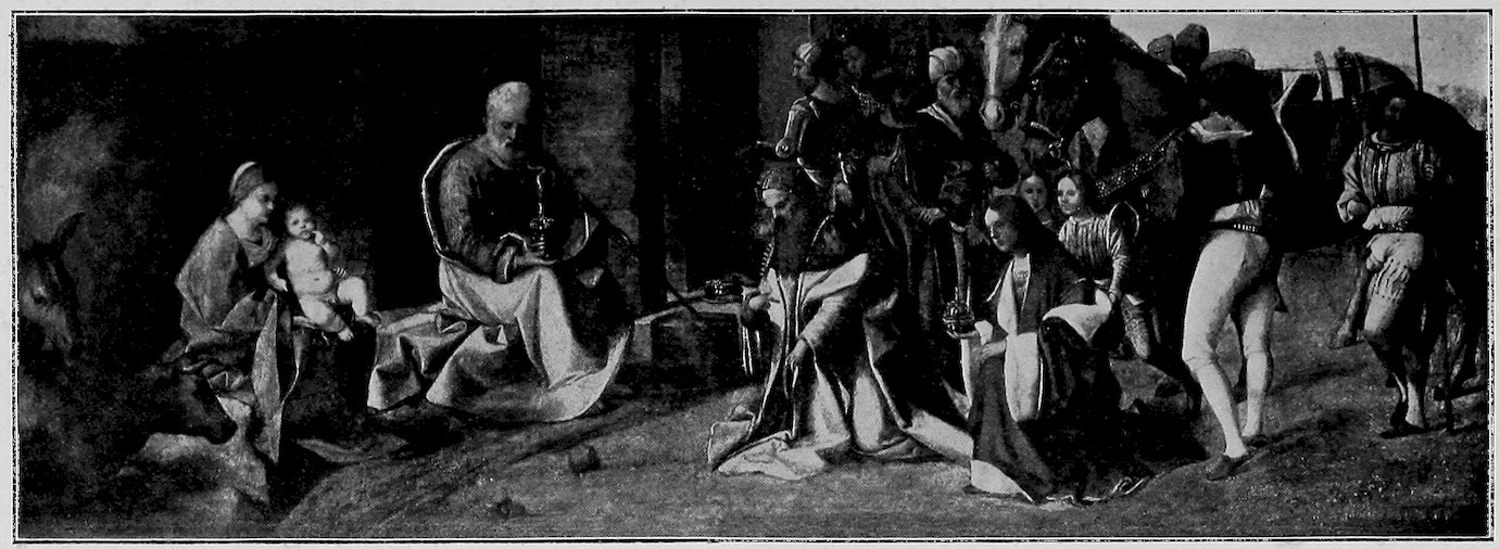 54. See Archivio Storico dell’ Arte, 1895, I, p. 77. In this passage the writer (Miss Ffoulkes) speaking of an exhibition in London mentions the Benson picture and the Epiphany. She thinks them by neither Giorgione, nor Catena, but offers no suggestion as to the painter except that there is another picture by him in the Venice Accademia attributed (wrongly) to Cordegliaghi.