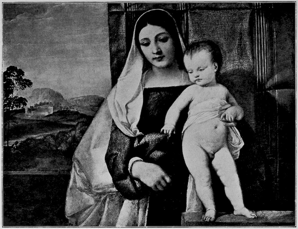 Giorgione used none of the affected graces or sentimentalities of Raphael, nor did he depend upon such weirdness as Leonardo chose; as a result, his figures are as much more satisfying to the inquiring intellect as a living fountain is compared with the mirage of the desert. His means are simple. There is no exaggeration of action, as in the Titian Child, but all is essentially delicate and infantine. There is no exaggeration of expression, but a slightly dreamy, far-away look as of powers still unwakened, and one feels, as before no other representations of the Child, that such as He might 206attain to even Calvary. Taken in connection with the agreement of the details, this spiritual similarity of the work to others that we know are by Giorgione must give him pause who should think to name Titian as the author.[77]