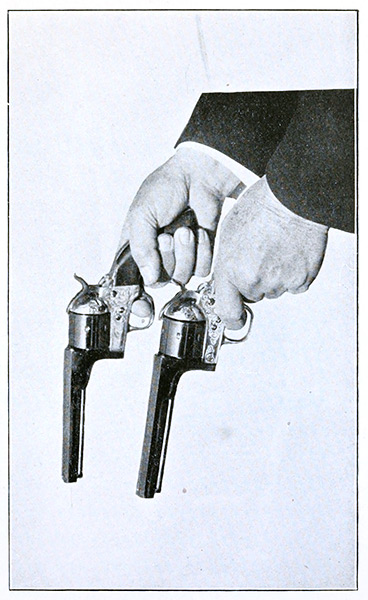 You take up the pair of revolvers with a new interest. Yes! they are handsome. [Pg 6]Shapely and well proportioned, they deserve your exclamation of admiration. The blued steel of barrels and cylinders contrasts attractively with the silver mounting of the handles, so well fitted to the grasp.