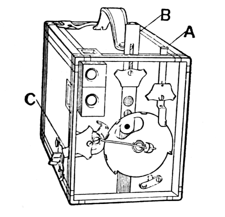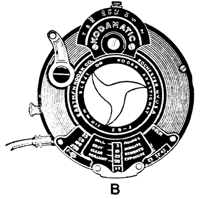 This form is known as a rotary shutter and may give snapshot exposures of approximately ¹/₂₅ of a second. An instantaneous exposure is made by pushing lever “C” across in one direction only. Ordinarily the largest of the three stop openings (controlled by slide “B”) is used for snapshots in good light, the middle one for snapshot exposures of very distant objects and for time exposures of interiors. The small one is more often used for time exposures outdoors. To make a time exposure slide “A” is pulled up and then when lever “C” is pushed across in one direction the shutter will open and remain open until lever “C” is pushed across in the opposite direction. Figure 5 [Pg 20] illustrates one of the more comprehensive types of shutters. The size of the stop opening is controlled by moving “B” to the proper f. value.
